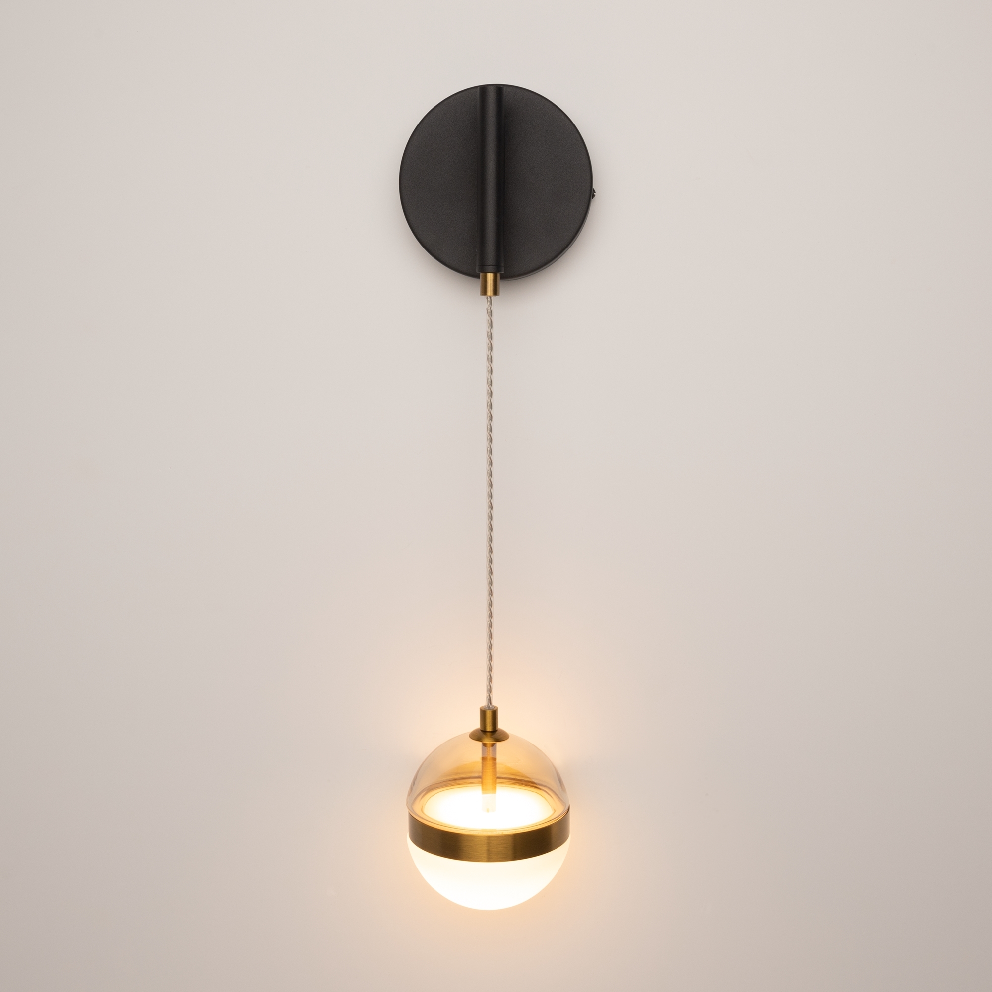 Черная потолочная чаша дополнена финишным антибликовым покрытием sandy, декоративный элемент плафона выполнен из металла цвета сатинированной латуни. Сочетание двух фактурных стекол в плафоне: нижняя полусфера из матового белого стекла для создания мягкого рассеянного света, верхняя часть плафона - из тонированного янтарного стекла. Внутри установлен LED-модуль, создающий равномерное освещение, направленное вверх и вниз. Цветовая температура – 3000К, угол рассеивания — 120°.